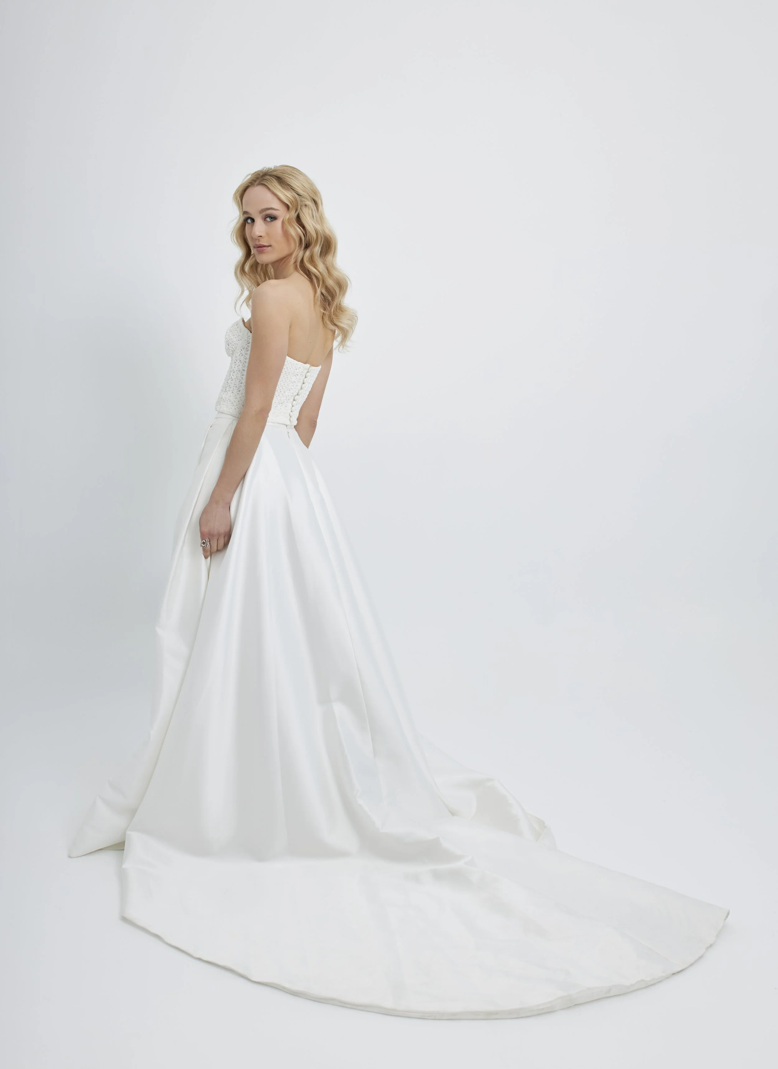 Mujer con vestido de novia blanco, en un fondo blanco, con cabello rubio rizado y maquillaje natural. Ver tamaño completo